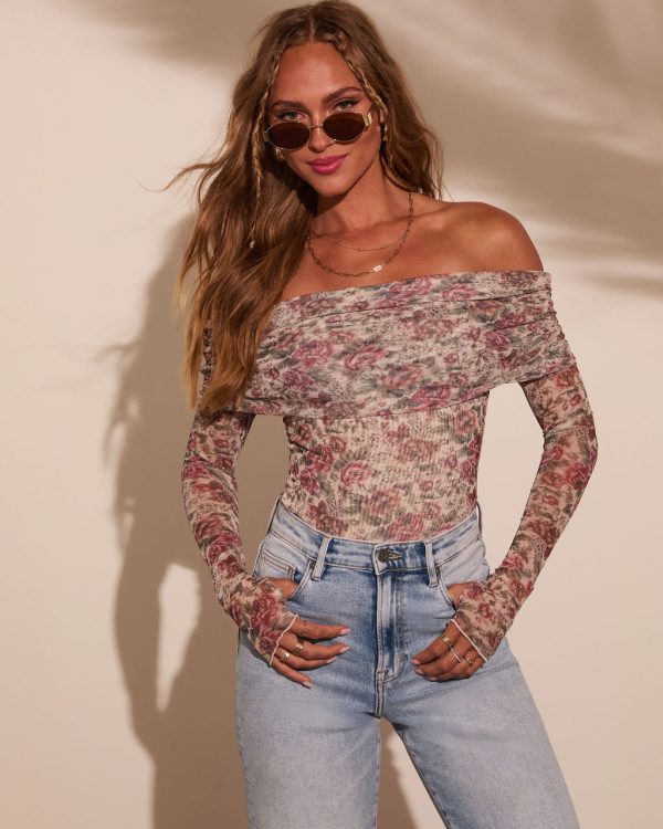 Sunset cocktails are meant to be paired with the Everlie Off The Shoulder Bodysuit. Draped in ruched mesh with a delicate floral design, this bodysuit is your go-to for capturing that boho-chic summer vibe. The off-the-shoulder silhouette frames your collarbones perfectly, while the playful lettuce trim at the cuffs adds a subtle touch of whimsy.