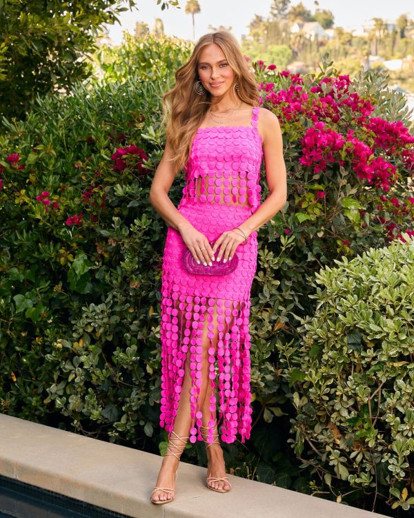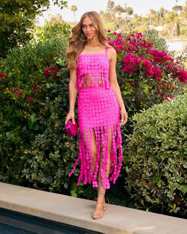 Own the room in this bold and playful design, say hello to the Rachelle Fringe Crop Top. This statement-making top features a daring circle cutout fringe design that brings serious texture and movement to your look. It’s the perfect balance of edgy and chic, whether you’re styling it for a night out or a special event. Pair it with the matching Rachelle Fringe Midi Skirt (sold separately) for a striking head-to-toe ensemble.