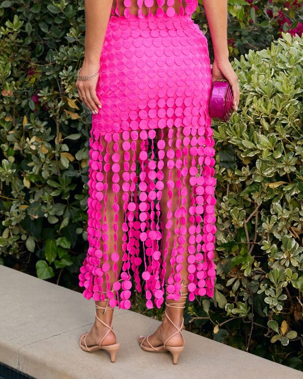 It’s time to unleash your inner fashion icon with the Rachelle Fringe Midi Skirt. Featuring a cutout fringe design that sways effortlessly around you with every step, this piece is the moment you’ve been waiting for that’s perfect for dancing the night away. Pair it with the matching Rachelle Fringe Crop Top (sold separately) for a stunning coordinated look.