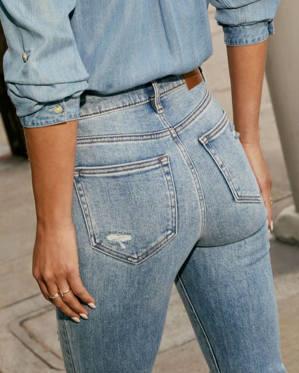 From brunch to date night, the Spring Stitch Distressed Flare Jeans are a fresh take on a retro-inspired favorite. These flares bring all the drama (in the best way) with their curve-hugging stretch denim, light whiskering, and perfectly placed distressed details for that effortlessly cool, lived-in look. The high-rise fit and 5-pocket styling keep it classic, while the flared silhouette gives you legs for days.