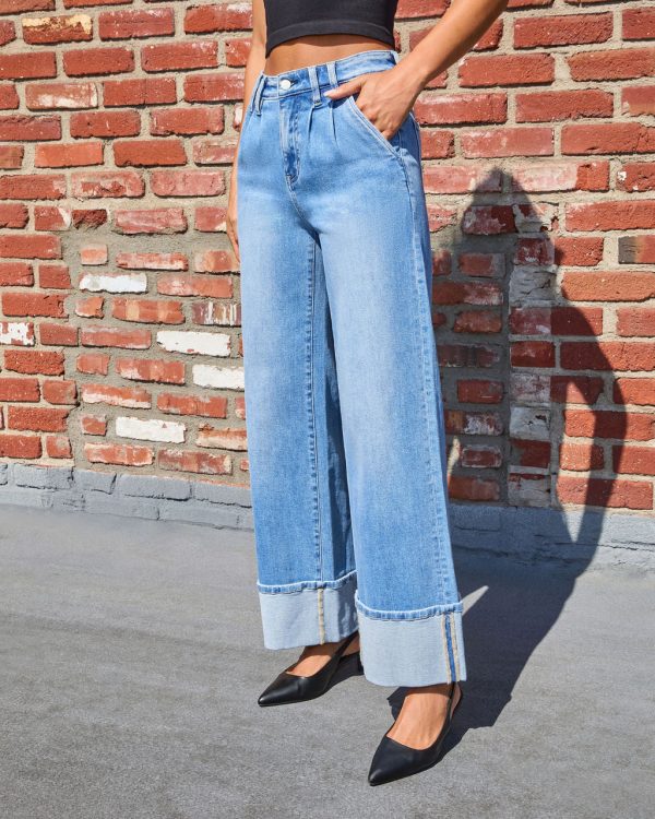 Say hello to your denim daydreams, Wanderblues Stretch Cuffed Wide Leg Jeans are made for movement, style, and everything in between. With a super stretch fit that hugs in all the right places, these jeans keep things comfy while looking totally polished. Subtle light whiskering and pleated waist details add a hint of vintage charm, while the wide leg silhouette and cuffed hems bring a relaxed, cool-girl vibe.