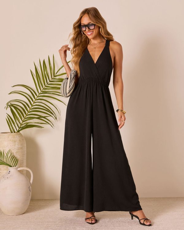 Meet your go-to for sunset dinners and rooftop lounging, the Salty Cabana Sleeveless Jumpsuit brings effortless glam with a tropical twist. Designed in sleek satin, it drapes like a dream with a surplice front that flatters without trying too hard. The crisscross back straps stretch for comfort, while an easy elastic waist keeps things breezy and pulled-together. From beachside sips to dancing under palm trees, this jumpsuit delivers bold elegance with minimal effort.
