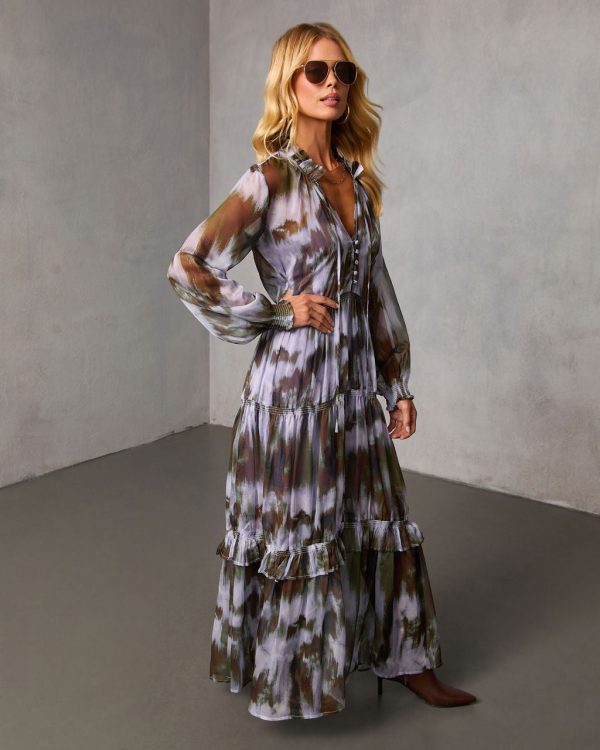 Float into fall with the Lasso the Moon Abstract Chiffon Maxi Dress, a dreamy statement piece that’s all about movement, color, and effortless elegance. The lightweight chiffon features a soft watercolor print that feels like wearable art, while the tiered design brings volume and flow with every step. A ruffle-trimmed split neckline with tie closure and partial front buttons add a romantic touch, and the bishop sleeves with smocked cuffs balance it all with subtle drama.