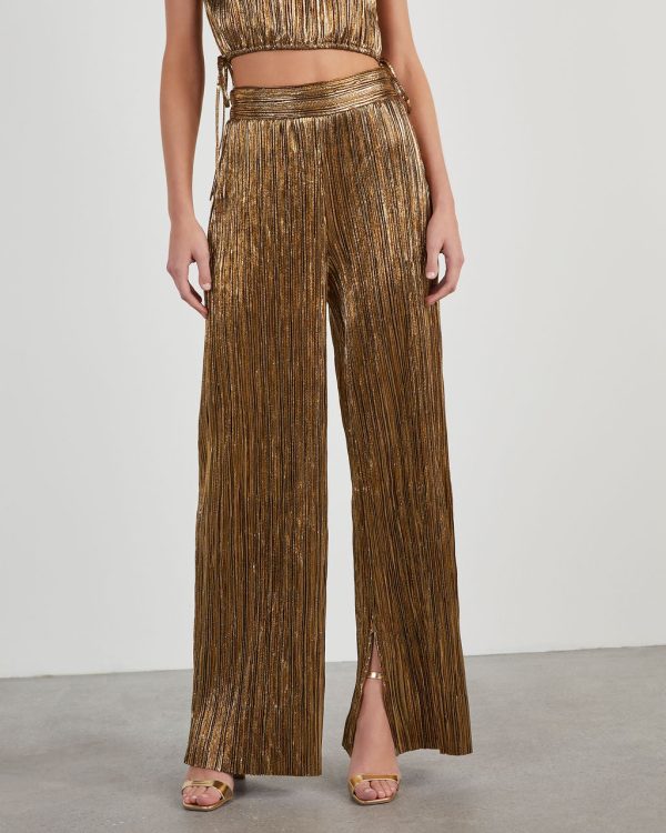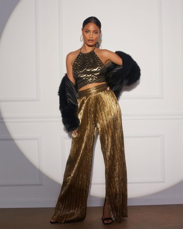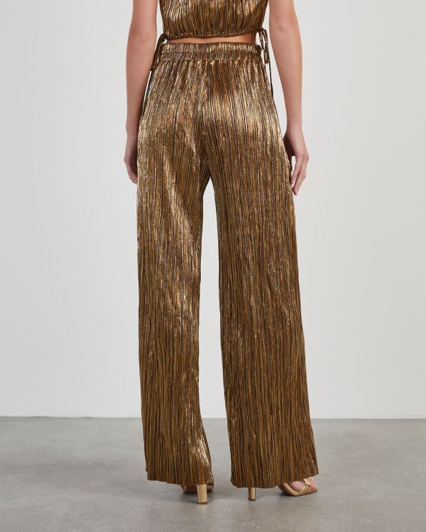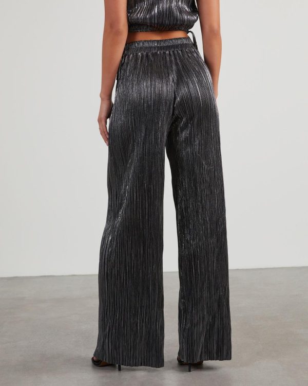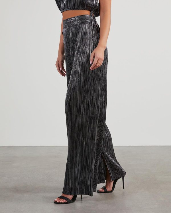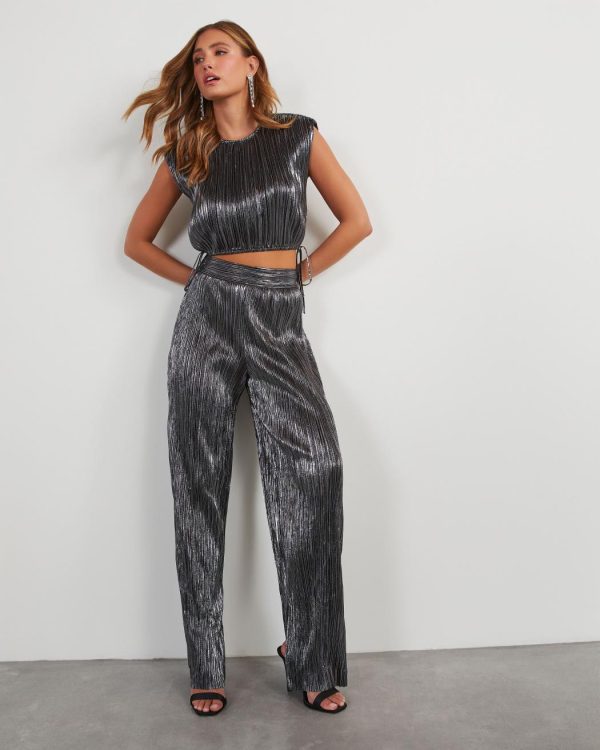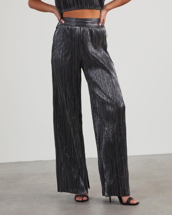 FOUND: your new favorite party pants. The Sinclair Metallic Plisse Trouser Pants come in a high-waisted, wide leg fit and was designed without any pockets or lining. Eye-catching and unique, this pair looks perfect with the matching Sinclair Metallic Plisse Crop Blouse.