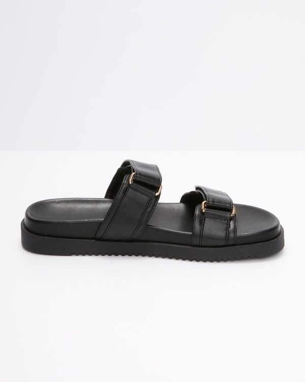 Whether you’re exploring the coast or relaxing by the pool, the Khai Hardware Accent Sandal brings relaxed elegance to every step. Crafted from smooth faux leather, and a dual velcro strap design with chic gold-tone accents, these sandals add a touch of luxury to your laid-back look.