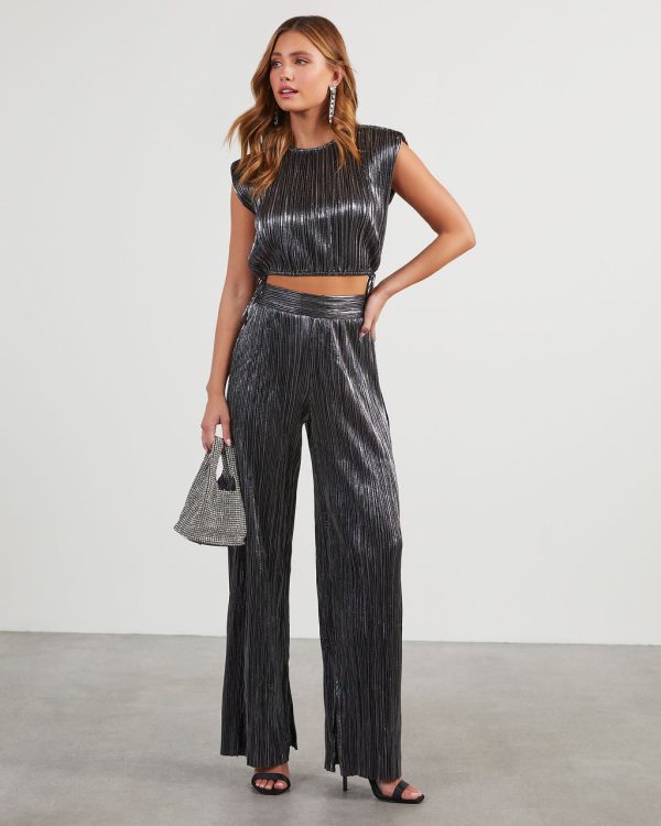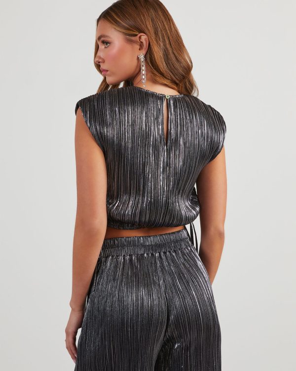 Cropped and shiny, the Sinclair Metallic Plisse Crop Blouse features a crew neckline and adjustable, side hem ties. It’s sleeveless and ultra-chic in a metallic plisse fabric. Pair it up with the matching Sinclair Metallic Plisse Trouser Pants for an on-point party look.
