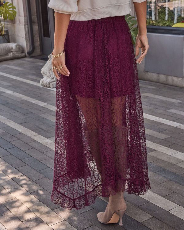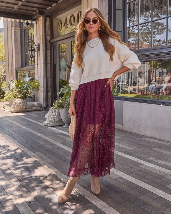 A little romance, a little edge, meet the Mulled Wine Lace Midi Skirt, your new fall favorite for looking effortlessly put-together. With its sheer lace overlay and delicate ruffle trims, this midi brings just the right amount of drama to any outfit. The relaxed fit and elastic waistband make it an easy yes for everything from afternoon strolls to evening plans. Style it with a chunky knit for contrast or a sleek bodysuit for a dressed-up vibe.