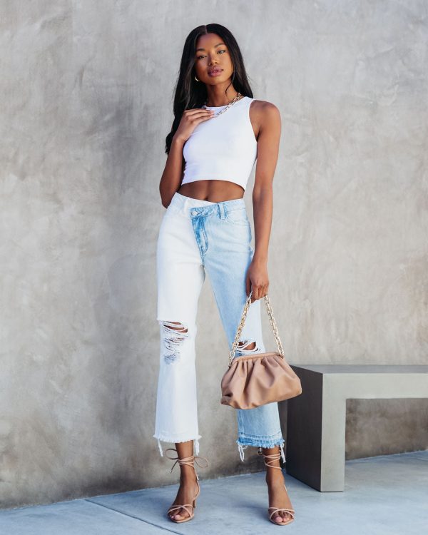Cool meets unique in the Wrenley High Rise Cross Over Two-Tone Straight Jeans in white and denim that features a relaxed fit.