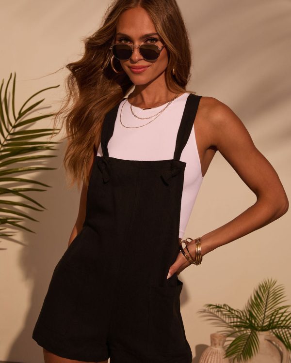 Embrace effortless style with our Northwest-inspired Cotton Linen Pocketed Romper! This versatile black romper features convenient front pockets and adjustable knotted strap closures for a customizable fit that moves with you throughout your day.