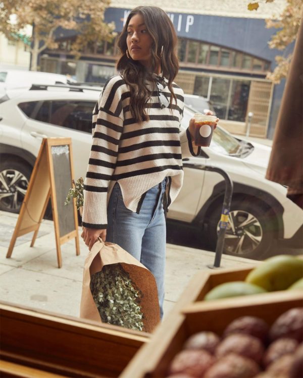 Elevate your casual wardrobe with this effortlessly chic striped knit sweater featuring timeless black and white contrast and stylish side slits for added movement.