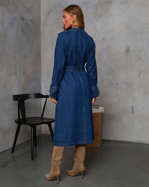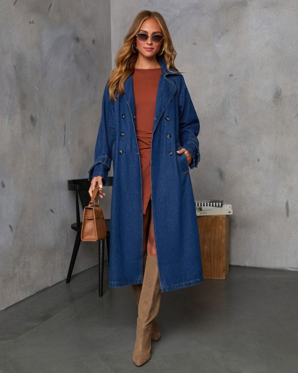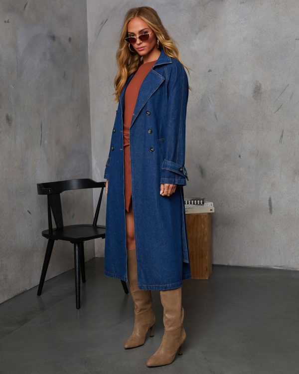 Meet your new fall essential – the Spiced Pear Belted Denim Trench Coat delivers timeless sophistication with contemporary flair. This versatile coat features a sharp double-breasted front with polished button closure and comes with a detachable waist tie that creates a flattering silhouette. Functional side slant pockets and adjustable belted cuffs offer both style and utility, while the back vent allows for comfortable, unrestricted movement throughout your day.